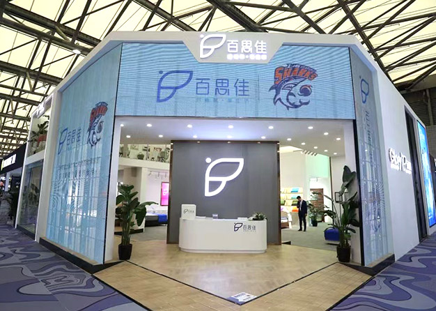 91视频影院展览工厂为-百思佳床垫参加2019上海家具展提供展台制作搭建服务。